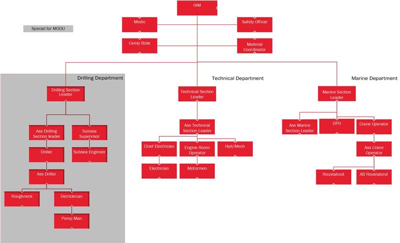 The set-up of a Mobile Offshore Unit [MOU] crew is very different from a traditional vessel crew. The MOU is run by an Offshore Installation Manager [OIM], who has overall responsibility for the unit. The crew is divided into a drilling team, technical team and marine team, who are headed by the Senior Toolpusher, Maintenance Supervisor and Barge Engineer, respectively. Each of them reports to the OIM. The drilling team focuses on the drilling operations, while the marine and technical crew perform relatively similar roles to those performed by their equivalent on a traditional vessel.